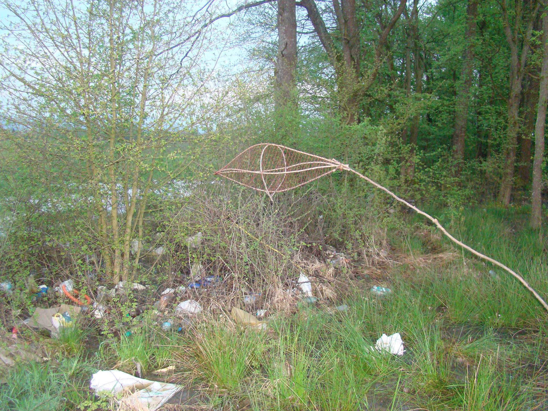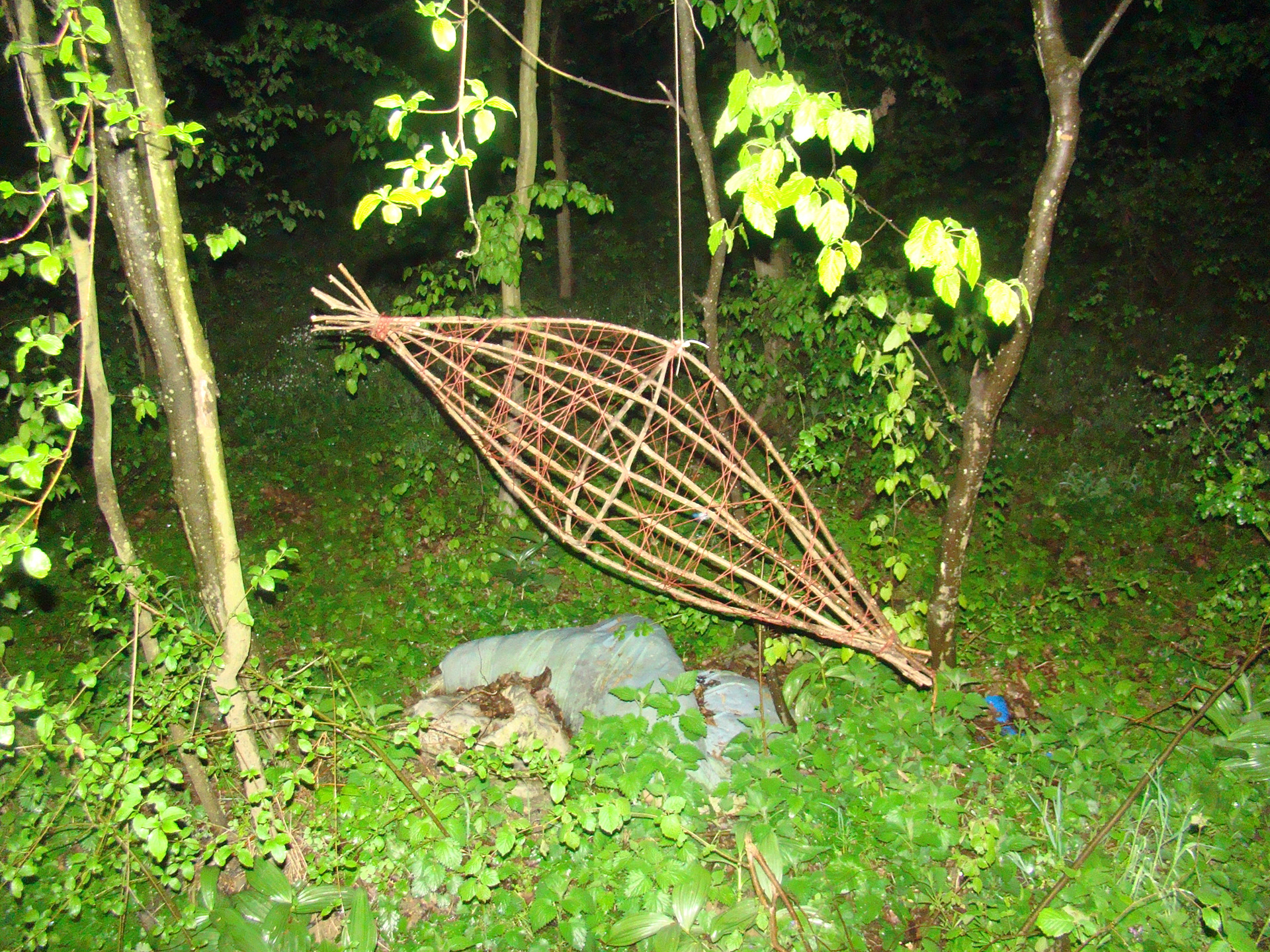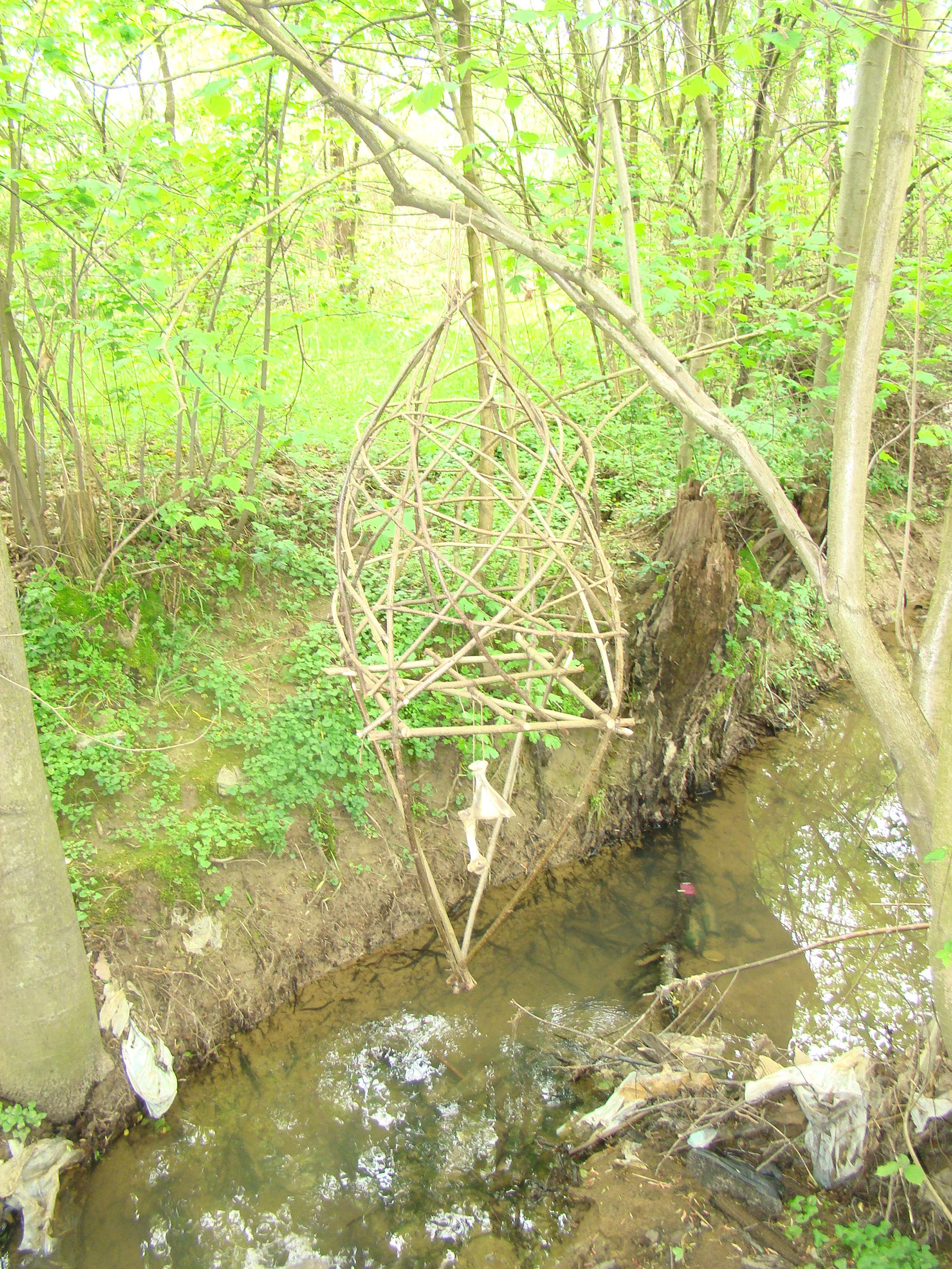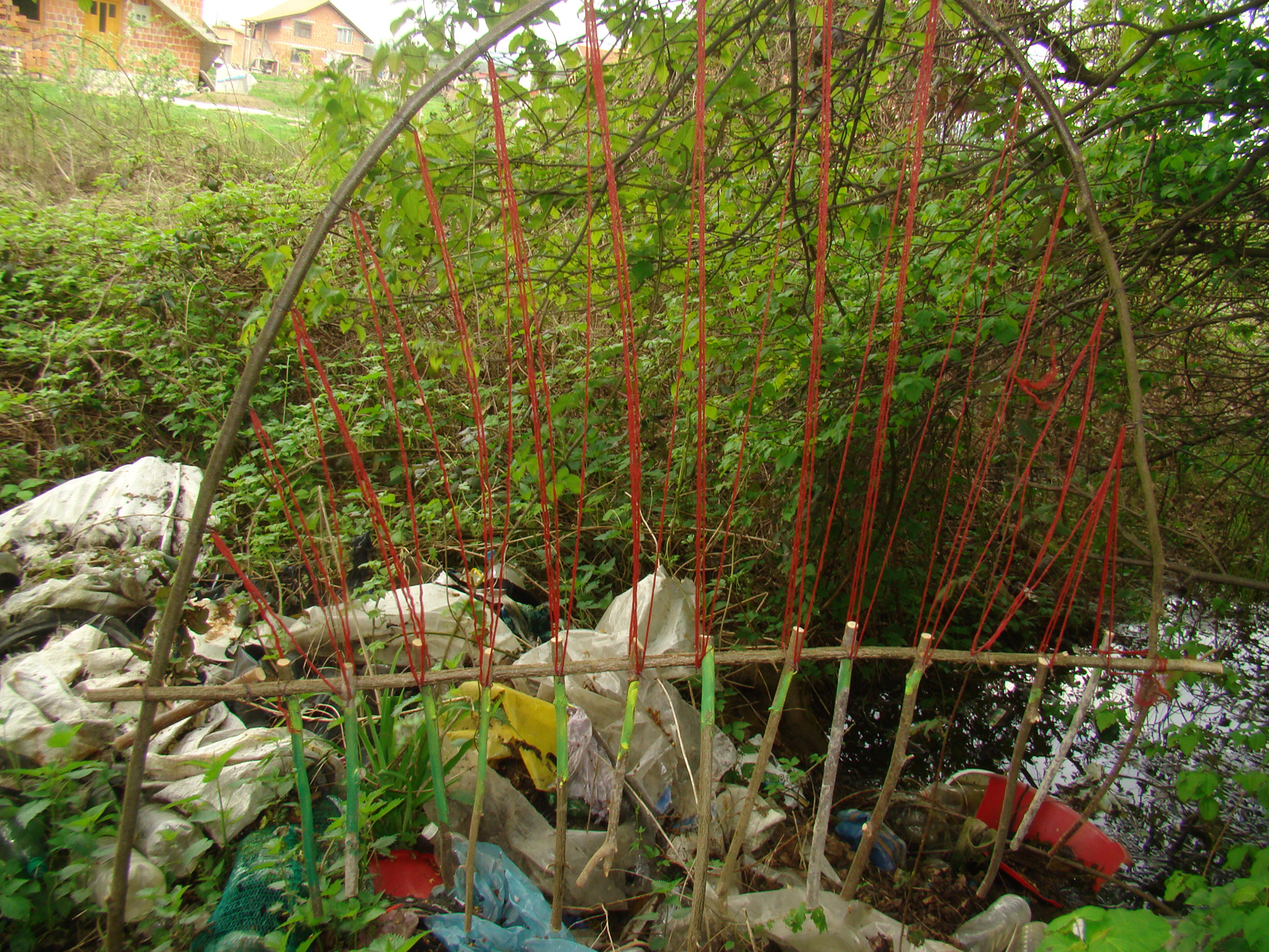 A series of installations made from biodegradable organic materials and placed on the locations of illegal dumpings around the village of Donji Garevci in North-West Bosnia. The installations were made intentionally reminiscent of objects from traditional folklore and were supposed to deter from further use of these illegal dumping sites and to eventually call for their removal. Illegal dumpings are common in Bosnia, plastic garbage but often even large scale scrap like broken washing machines and fridges are simply tossed in the rivers.