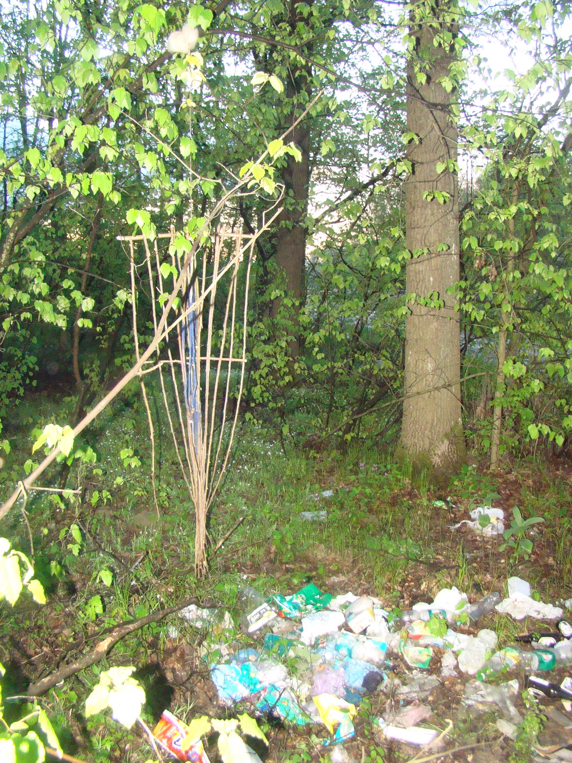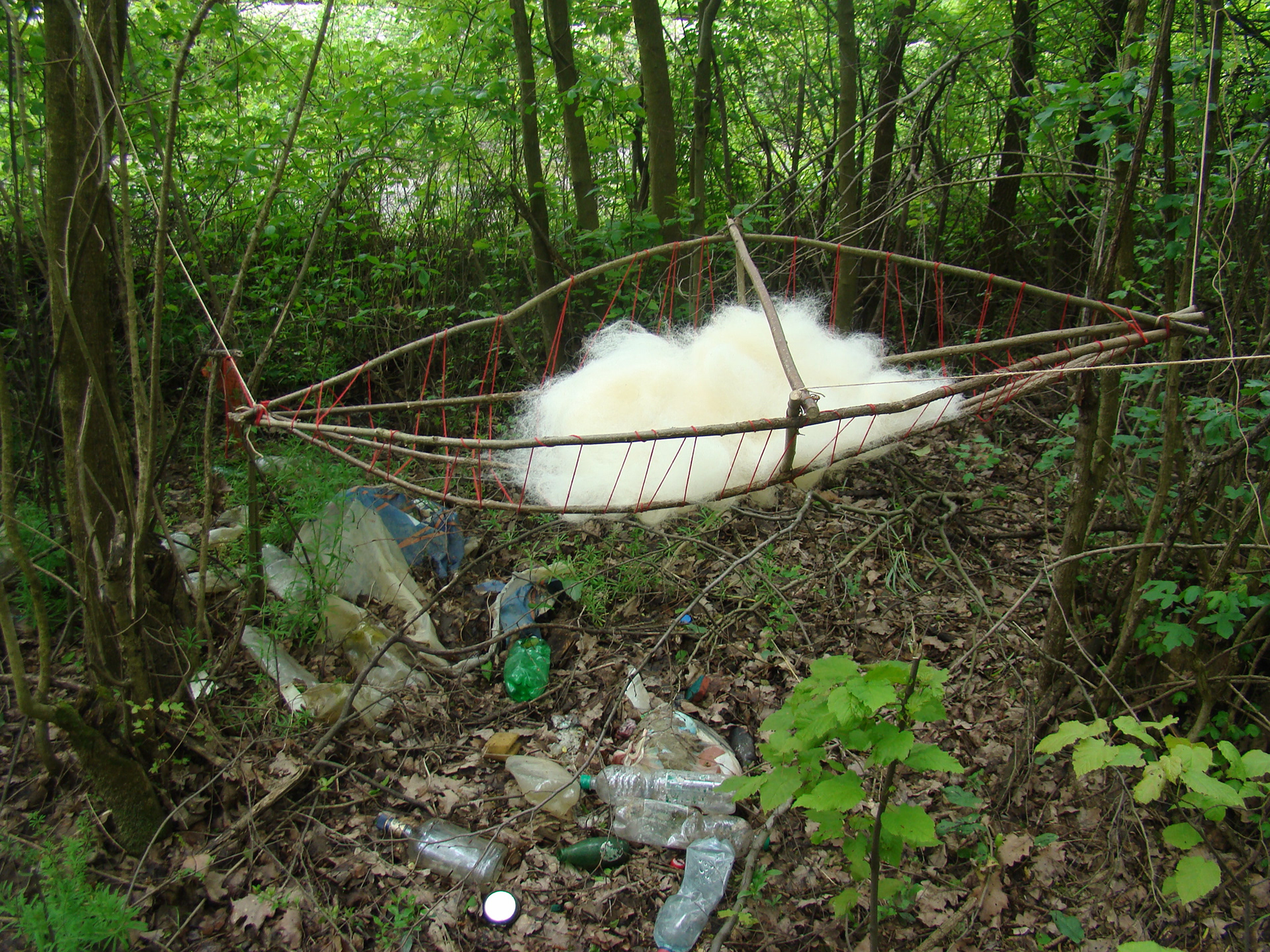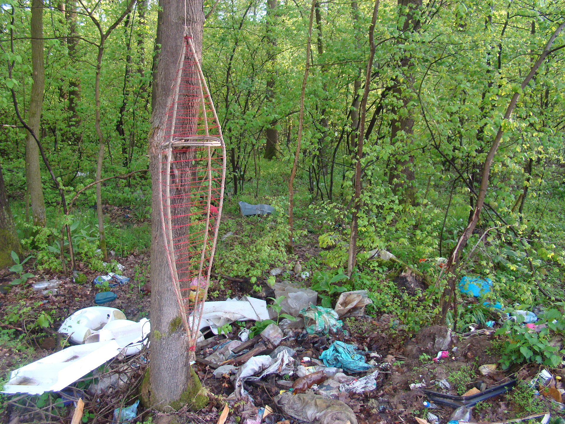 A series of installations made from biodegradable organic materials and placed on the locations of illegal dumpings around the village of Donji Garevci in North-West Bosnia. The installations were made intentionally reminiscent of objects from traditional folklore and were supposed to deter from further use of these illegal dumping sites and to eventually call for their removal. Illegal dumpings are common in Bosnia, plastic garbage but often even large scale scrap like broken washing machines and fridges are simply tossed in the rivers.