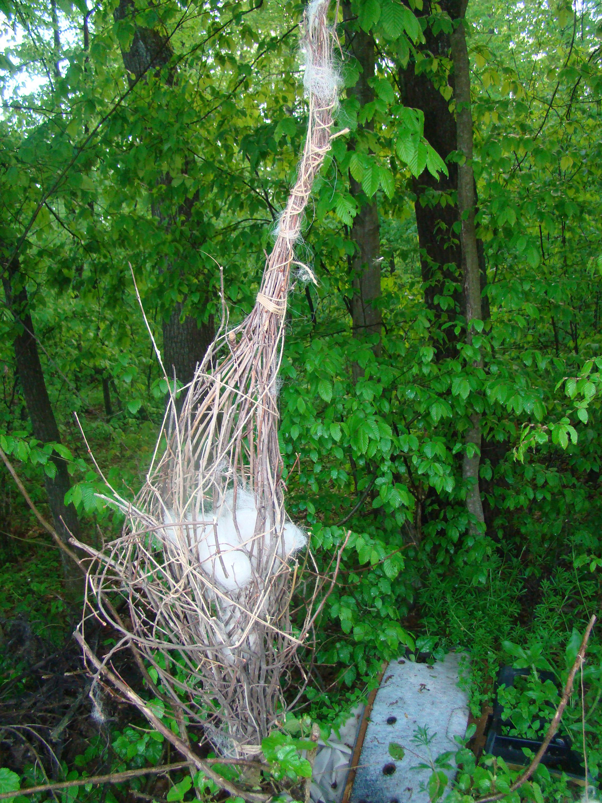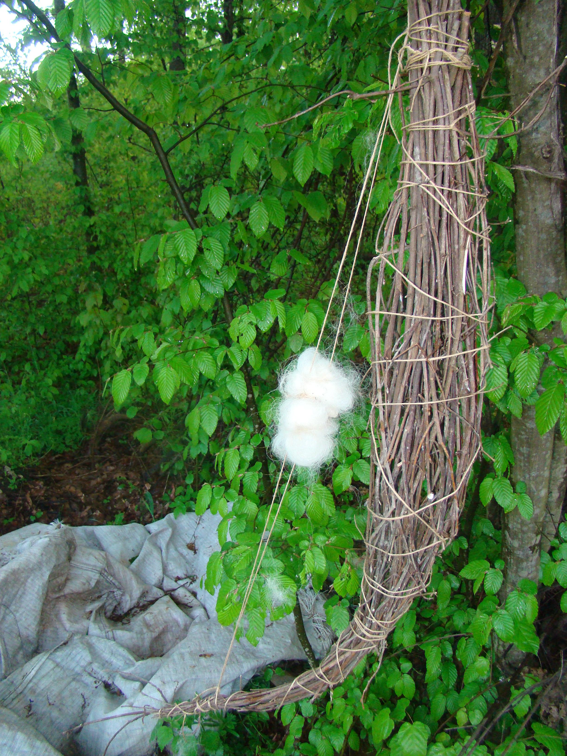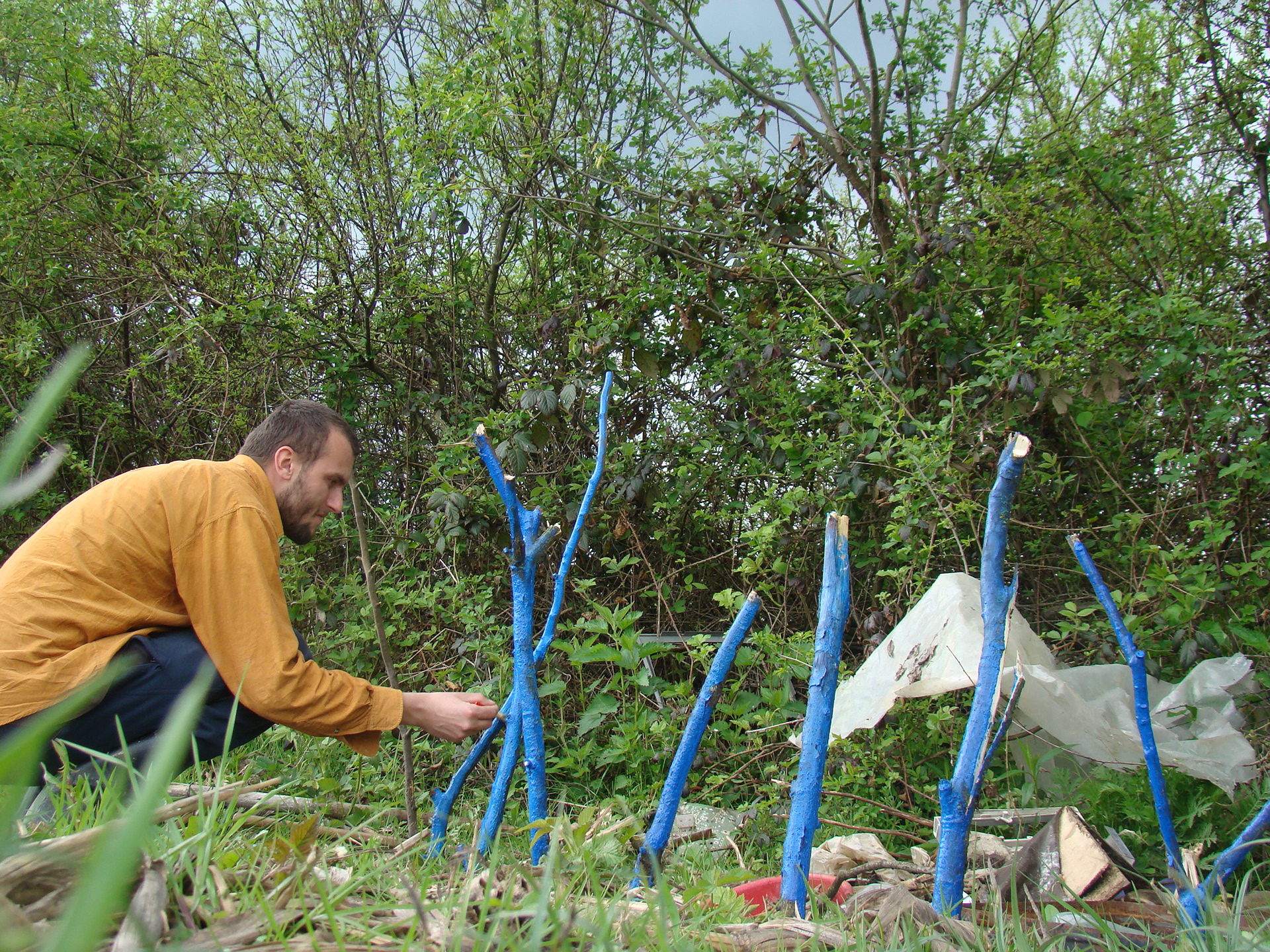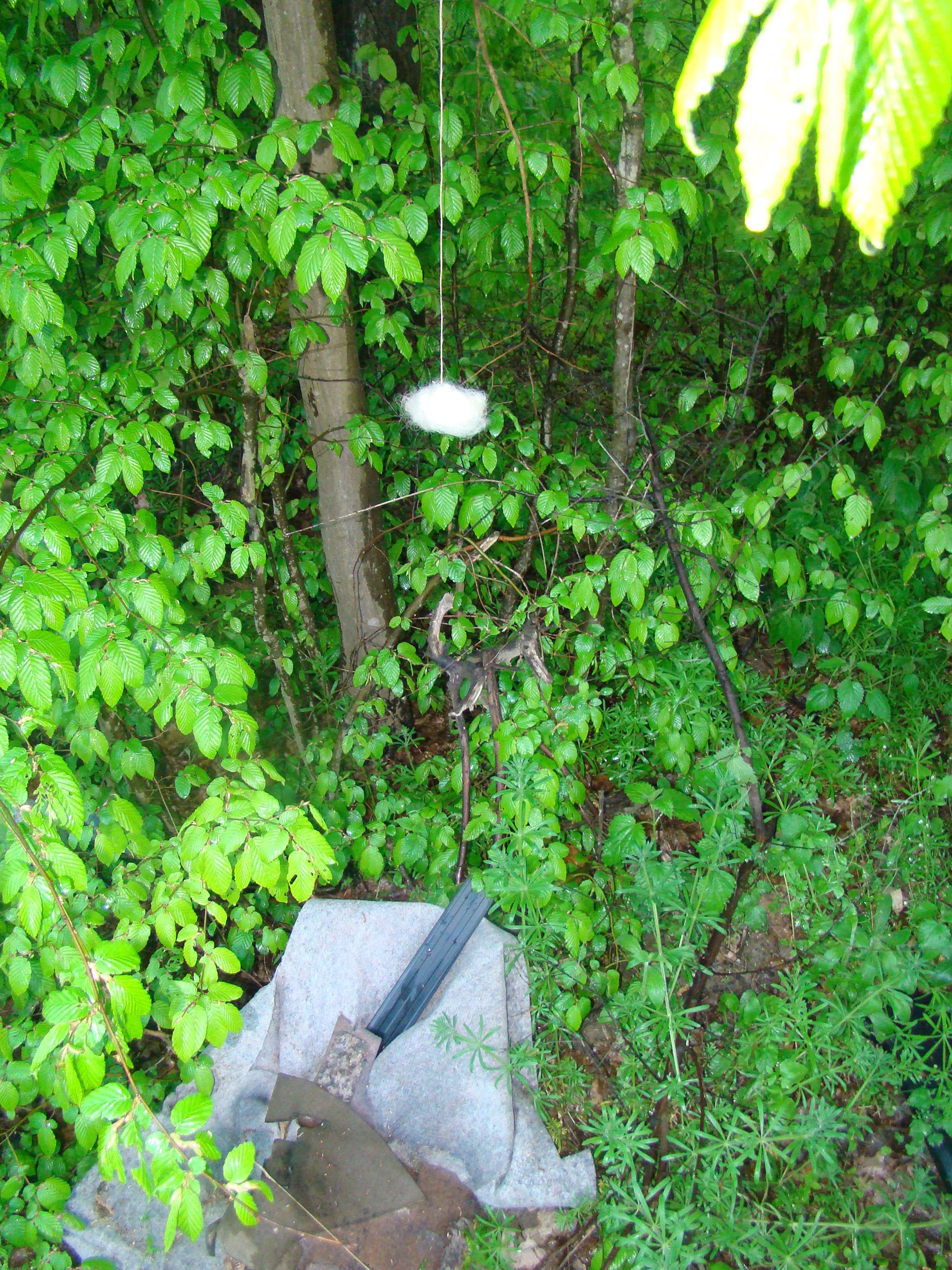 A series of installations made from biodegradable organic materials and placed on the locations of illegal dumpings around the village of Donji Garevci in North-West Bosnia. The installations were made intentionally reminiscent of objects from traditional folklore and were supposed to deter from further use of these illegal dumping sites and to eventually call for their removal. Illegal dumpings are common in Bosnia, plastic garbage but often even large scale scrap like broken washing machines and fridges are simply tossed in the rivers.