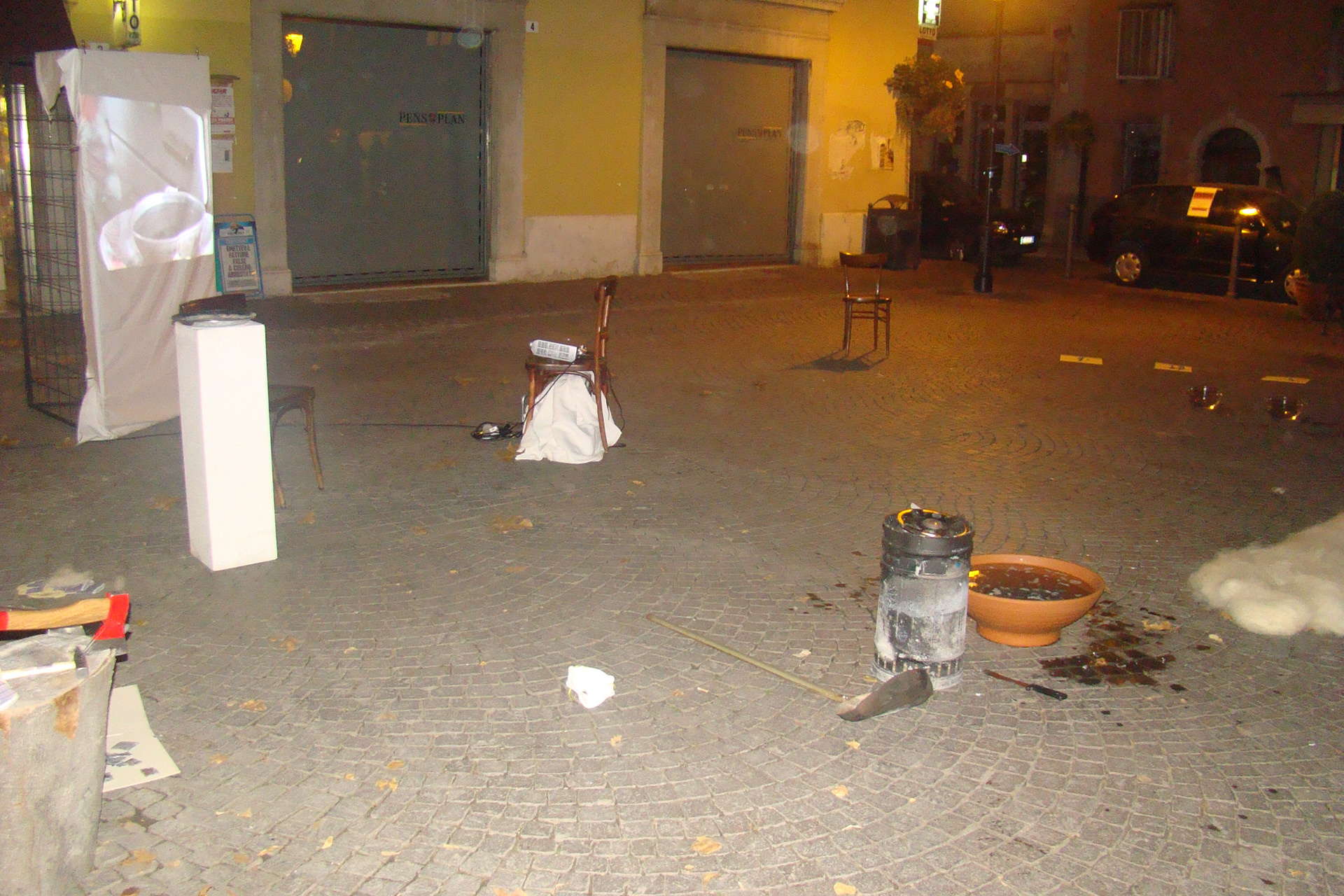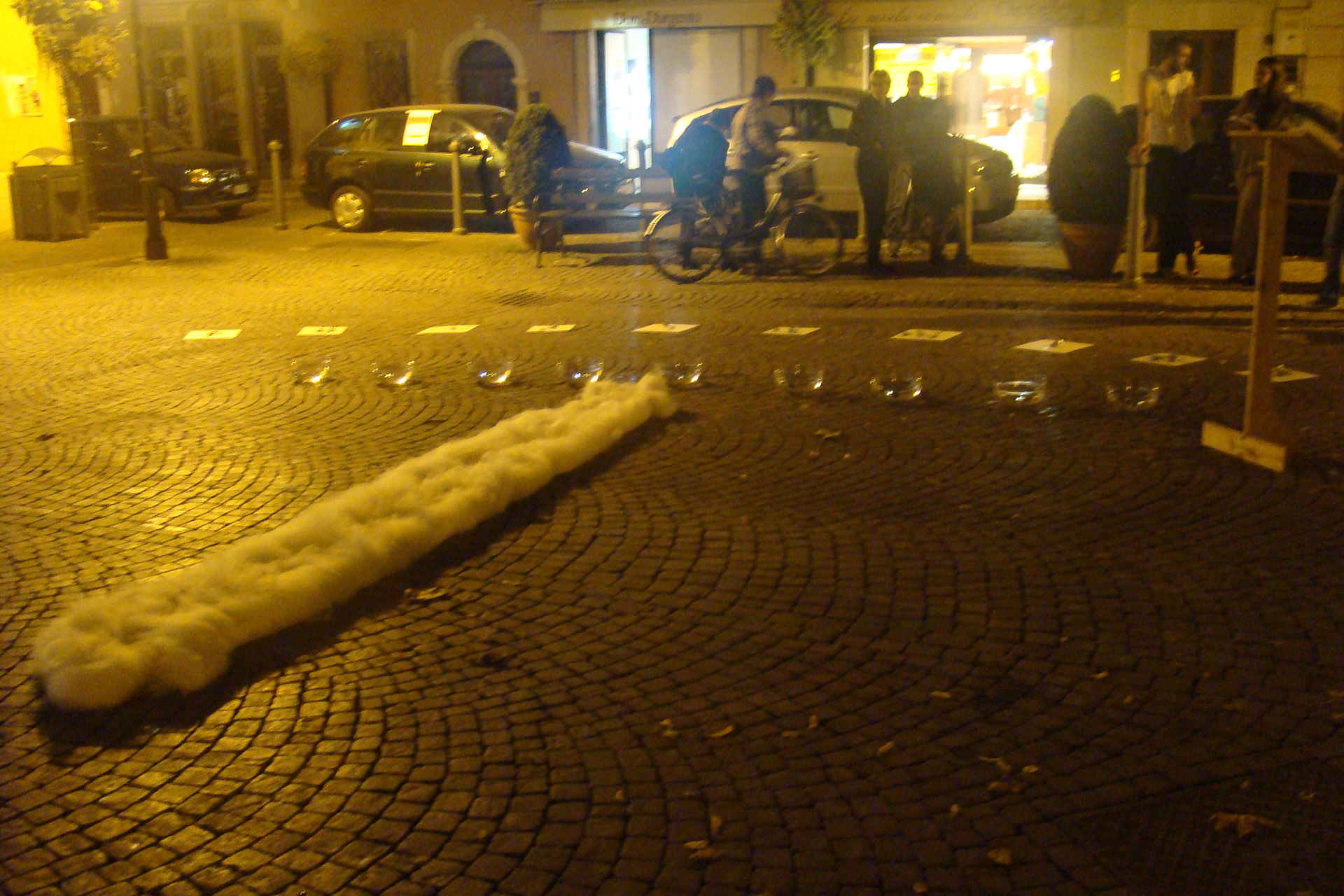 The following year we were invited by the Andromeda Gallery in Trento to present the project of the Imaginary Pavilion of Bosnia and Herzegovina within the Manifesta 7 Parallel events. Beside the Venice action we showed our own artworks and did a group performance – a reenactment of the traditional Balkan ritual of fear smelting in one of the public squares in Trento. We saw the Imaginary Pavilion as an opportunity to rethink and explore those concepts or constructs that, in our opinion, were "imaginary" and as such, enhancing the interpersonal and intercultural conflicts and fostering stereotypes and prejudices. One of these concepts was fear in all its expressions: irrational fears or phobias, fear of death, fear of otherness and similar. The fear, we knew, is also an excellent accomplice to those who want to divide and control.