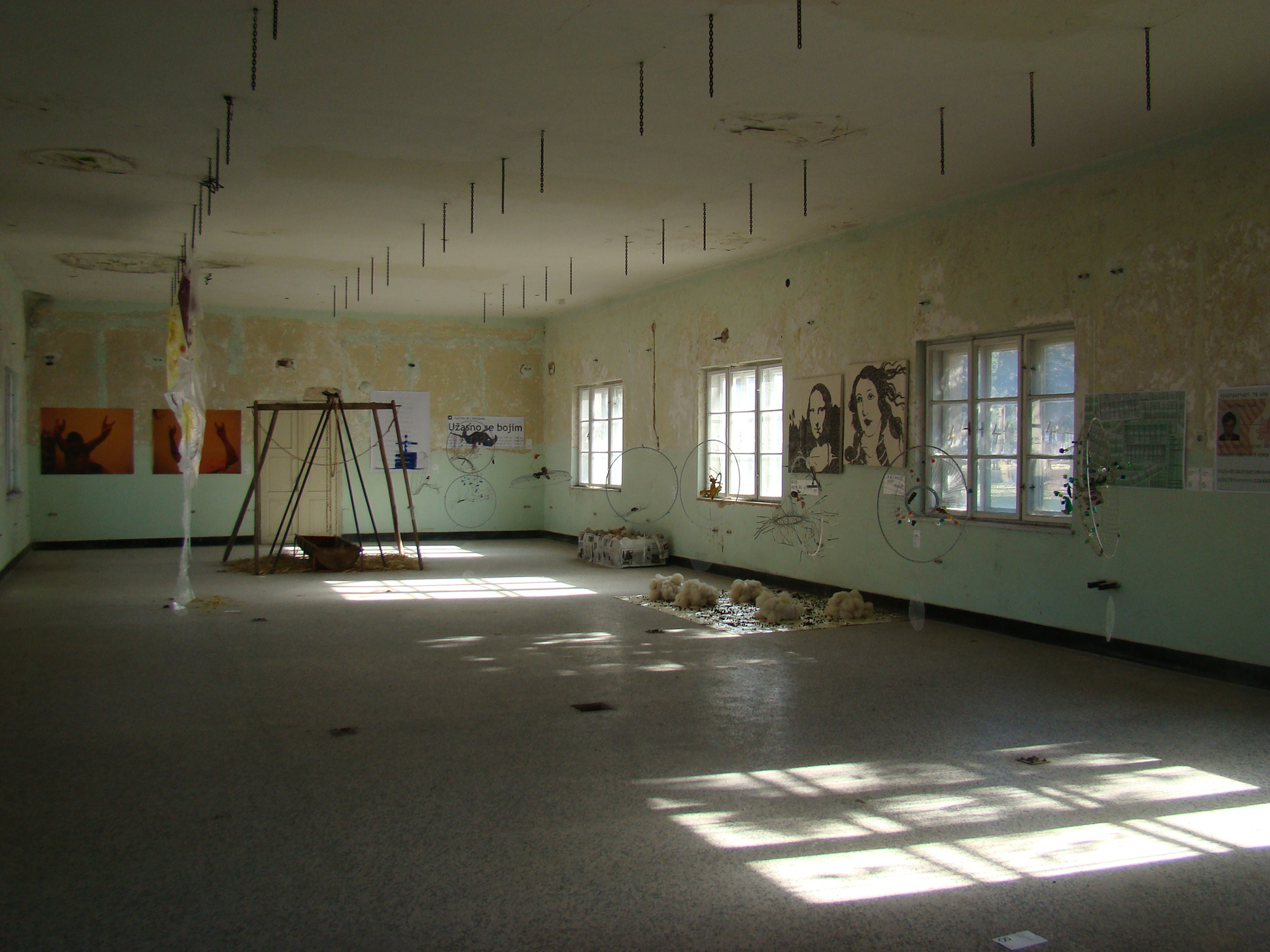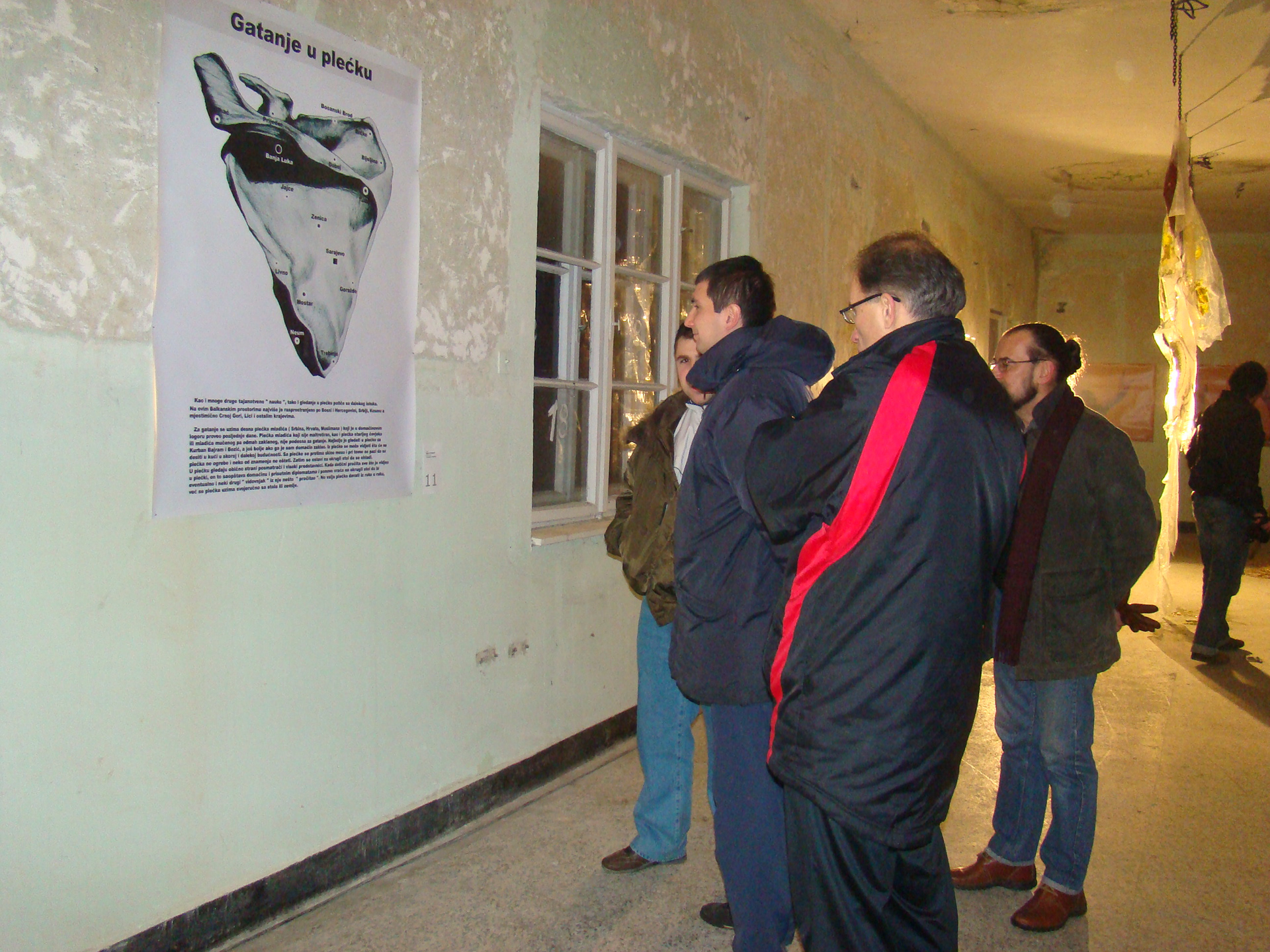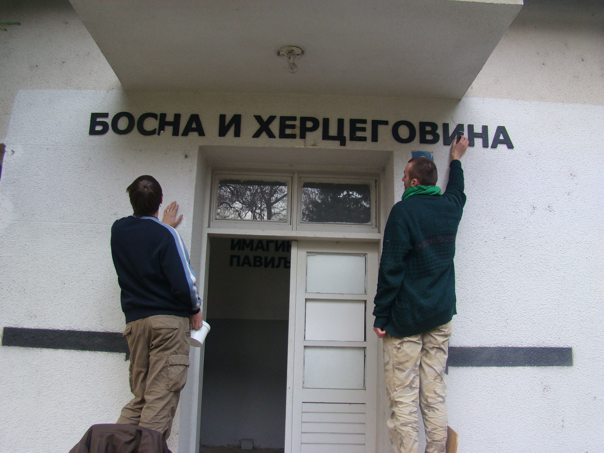 Once home from Venice we wanted to present our action to the local public and use this as an opportunity to raise the question of the lack of state-sponsored artistic representation of our arts on international level. We were offered a space at our Academy campus in Banja Luka where we all previously studied or were studying at that moment. The country´s 2nd biggest city of Banja Luka is the capital of the Serb-ruled entity of Bosnia and Herzegovina, the other entity being the Federation of Bosnia and Herzegovina controlled by Bosniaks and Croats. However, political and cultural tendencies of the Serb-controlled entity are to distance themselves from anything emphasizing their Bosnian identity. We were well aware of the existence of this sentiment but knew little of how much it was part of the agenda of the local policy makers. When we actually opened the exhibition we invited other of our colleagues who were not part of our association but shared our general concerns about our state´s cultural policy. To mimic the national pavilions of the Venice Biennale – the event that triggered our interest for this topic and set us to action, we hang up the name of our country above the exhibition entrance. An immediate reaction of the Academy administration and of the University of Banja Luka´s rector Stanko Stanic ensued. We were ordered to put down the country's name or the exhibition would be cancelled. It didn't help the name of the country was written only in cyrillic alphabet. We complied with this censorship request only partly, removing some of the letters and changing the meaning what was written into "Barefoot or boss & shit". Other than what we expected, this title turned out to be less provocative for the administration and was allowed to stay.