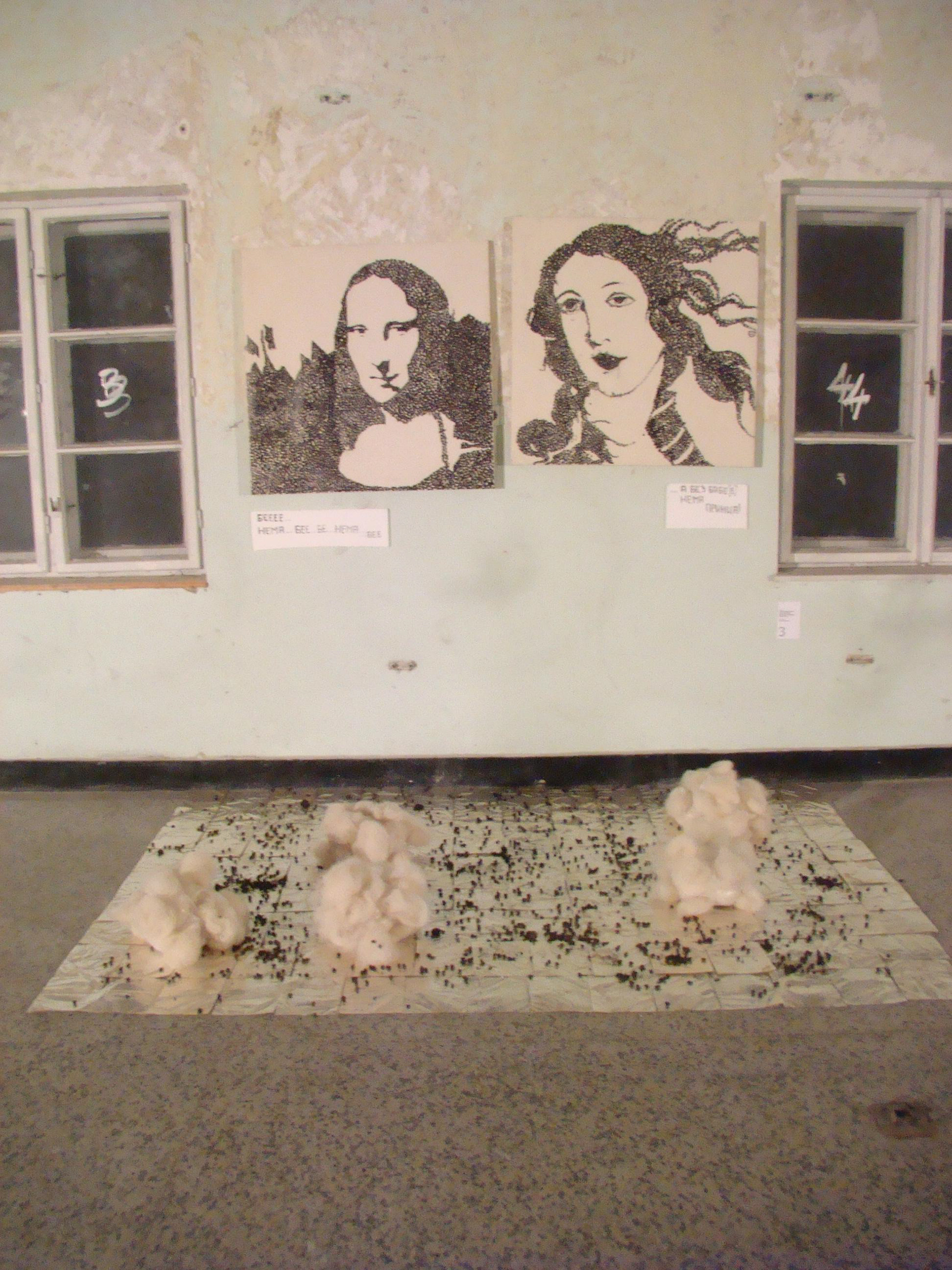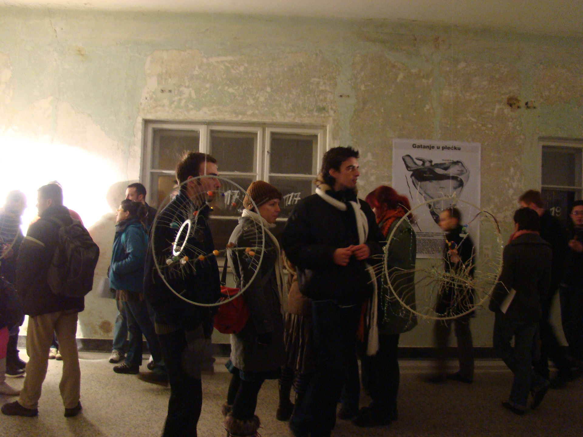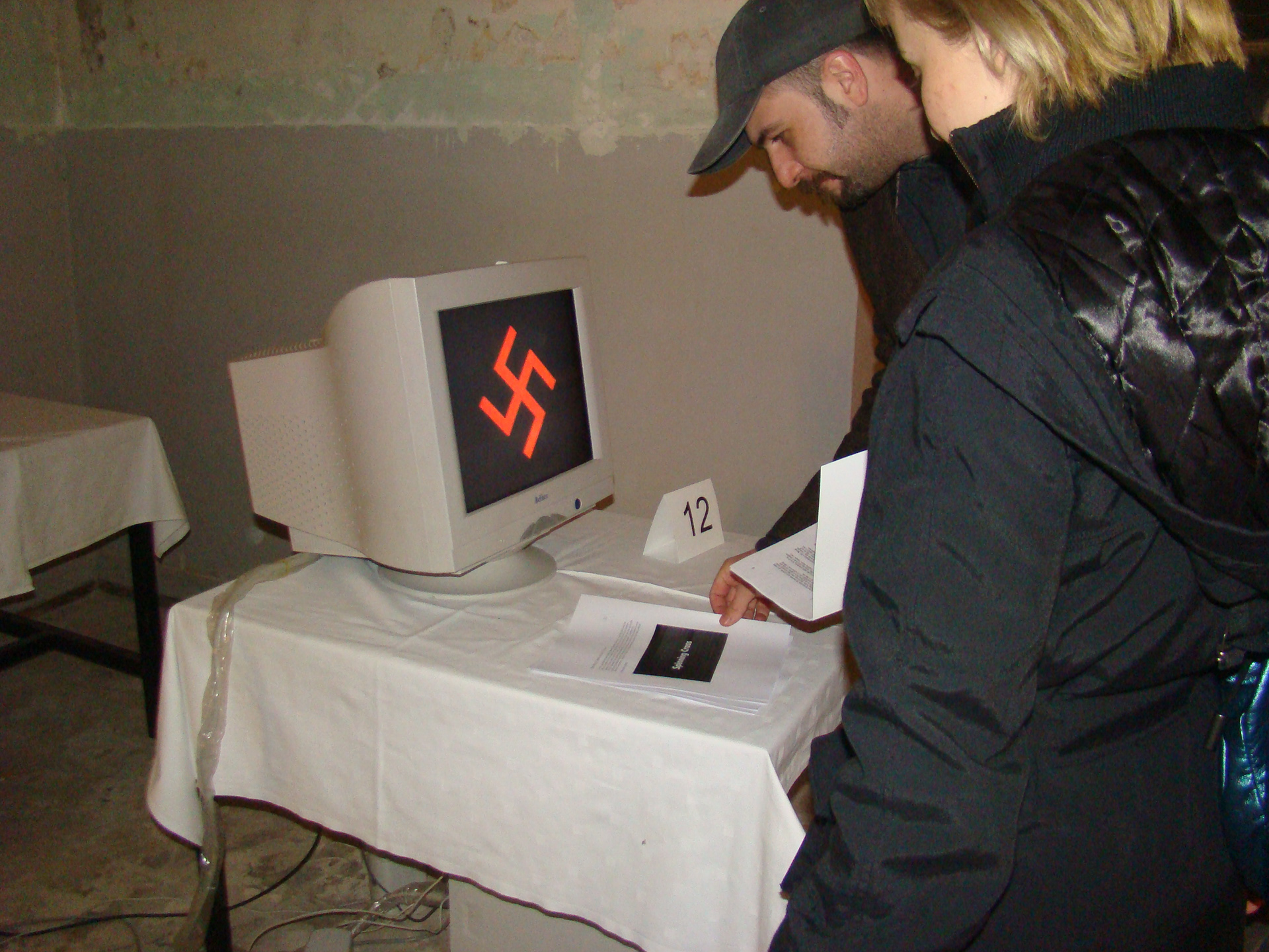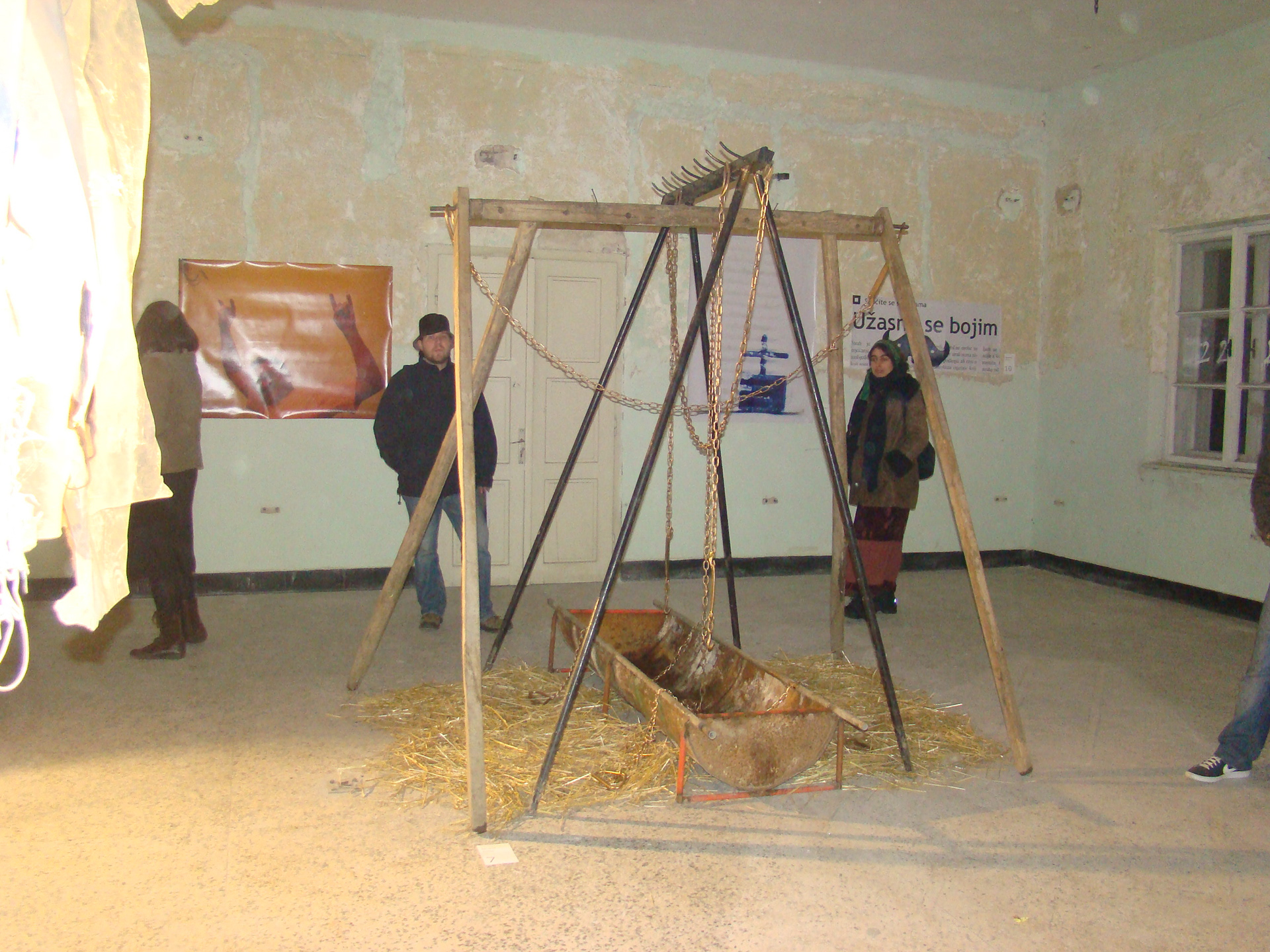 Once home from Venice we wanted to present our action to the local public and use this as an opportunity to raise the question of the lack of state-sponsored artistic representation of our arts on international level. We were offered a space at our Academy campus in Banja Luka where we all previously studied or were studying at that moment. The country´s 2nd biggest city of Banja Luka is the capital of the Serb-ruled entity of Bosnia and Herzegovina, the other entity being the Federation of Bosnia and Herzegovina controlled by Bosniaks and Croats. However, political and cultural tendencies of the Serb-controlled entity are to distance themselves from anything emphasizing their Bosnian identity. We were well aware of the existence of this sentiment but knew little of how much it was part of the agenda of the local policy makers. When we actually opened the exhibition we invited other of our colleagues who were not part of our association but shared our general concerns about our state´s cultural policy. To mimic the national pavilions of the Venice Biennale – the event that triggered our interest for this topic and set us to action, we hang up the name of our country above the exhibition entrance. An immediate reaction of the Academy administration and of the University of Banja Luka´s rector Stanko Stanic ensued. We were ordered to put down the country's name or the exhibition would be cancelled. It didn't help the name of the country was written only in cyrillic alphabet. We complied with this censorship request only partly, removing some of the letters and changing the meaning what was written into "Barefoot or boss & shit". Other than what we expected, this title turned out to be less provocative for the administration and was allowed to stay.